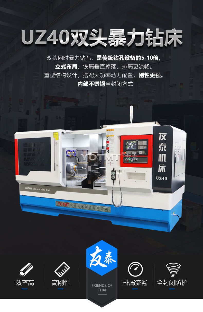 双头同时暴力钻孔,是传统钻孔设备的5-10倍,立式布局,铁屑垂直掉落,排屑更流畅。重型结构设计,搭配大功率动力配置,刚性更强。